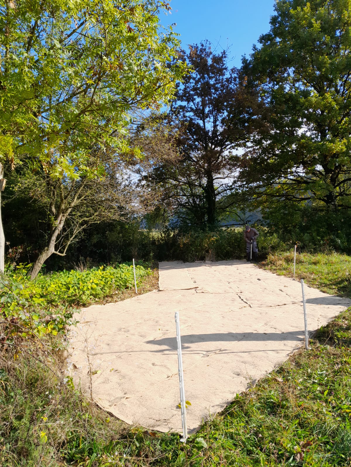 En automne 2025, un projet expérimental voit le jour dans la réserve naturelle de la Robertsau-La Wantzenau, où se situe la parcelle principal de renouée du Japon. Après un ultime arrachage, la parcelle a été recouverte d’un voile de plantation pour freiner les futures pousses du printemps prochain.