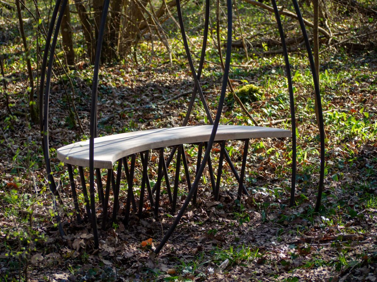 L’installation prend la forme d’un banc en bois et en acier, mettant en scène le dialogue entre nature et intervention humaine.